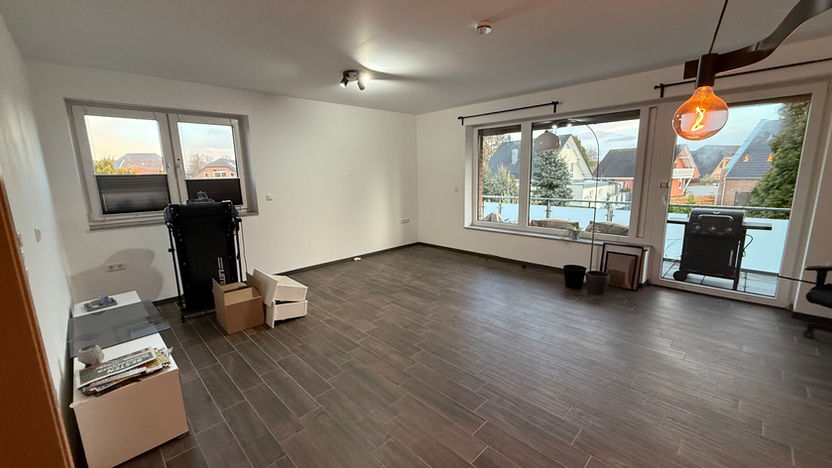 Von dem Flur gelangt man in das großzügige, helle Wohnzimmer. Hier befindet sich auch der Zugang zum Balkon.
